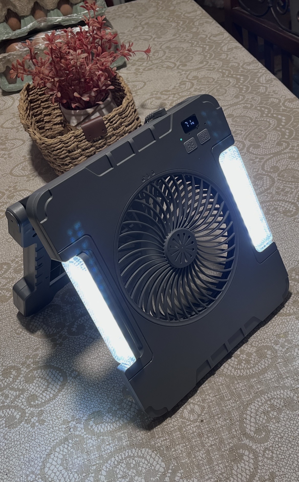 Combina un ventilador, una lámpara LED y un cargador portátil (power bank).