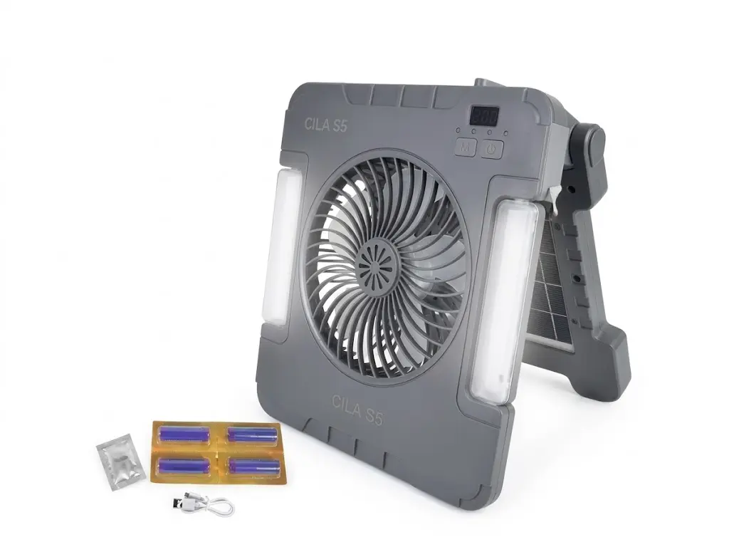 Combina un ventilador, una lámpara LED y un cargador portátil (power bank).
